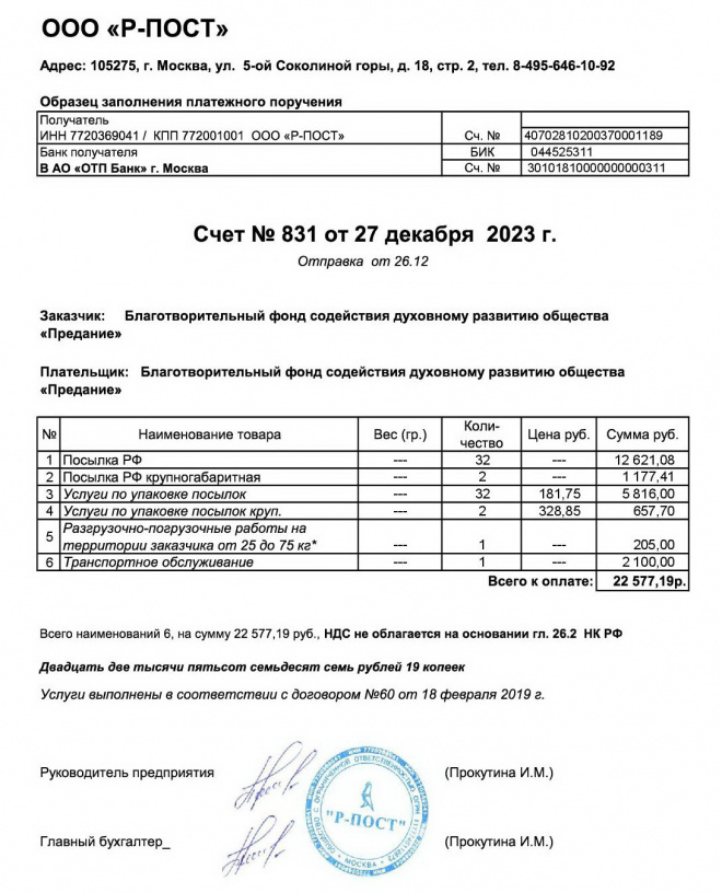 Оплачен счет за услуги по упаковке и отправке посылок с Рождественскими подарками
