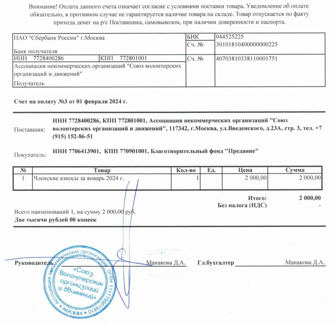 Перечислены членские взносы за январь 2024 г. в "Союз волонтерских организаций и движений"