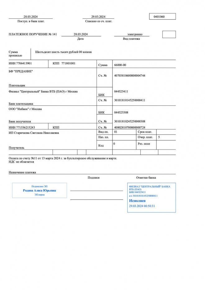 Оплачен счет за бухгалтерское обслуживание портала "Предание" в марте 2024 г.
