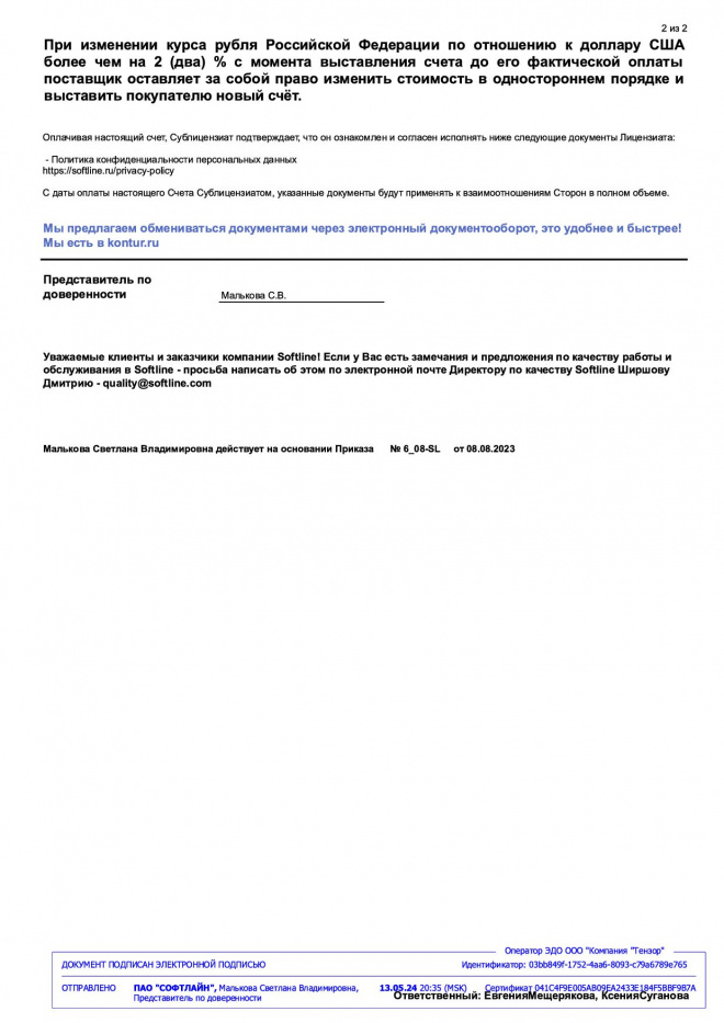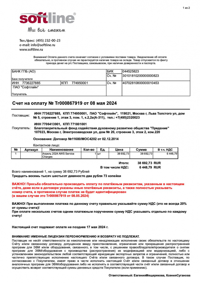 Оплачен счет за размещение видеоматериалов в "облачном сервисе" в апреле 2024 г.