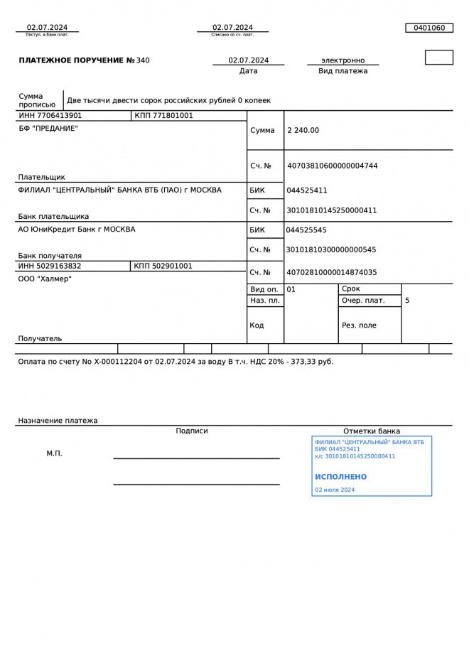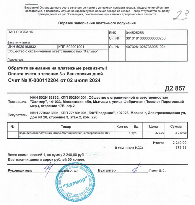 Оплачена покупка питьевой воды для офиса