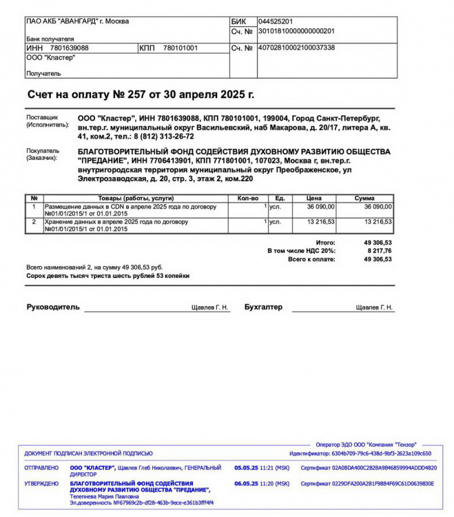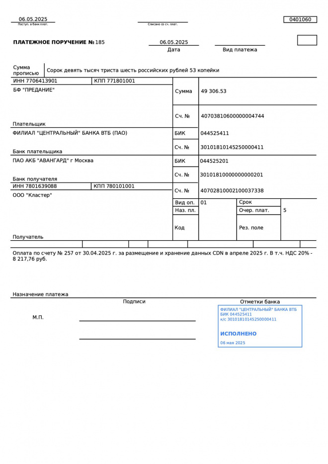 Оплачен счет за размещение материалов медиатеки в "облачном сервисе" в апреле 2025 г.