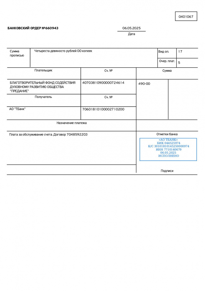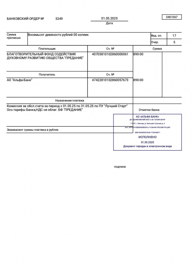 Комиссии по обслуживанию банковских счетов за май 2025 г.