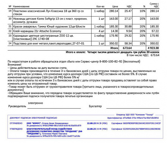 Пожертвование согласно ст.582 ГК РФ. Без налога (НДС)