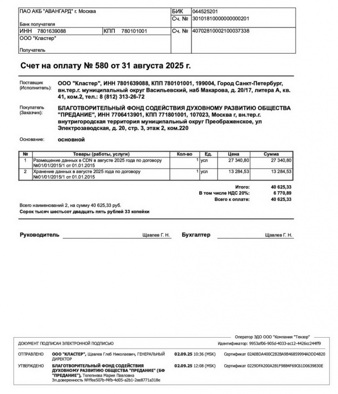 Оплачен счет за размещение материалов медиатеки в "облачном сервисе" в августе 2025 г.