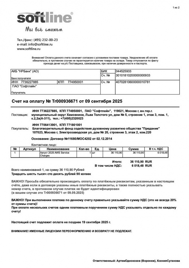 Оплачен счет за размещение видеоматериалов в "облачном сервисе" в августе 2025 г.