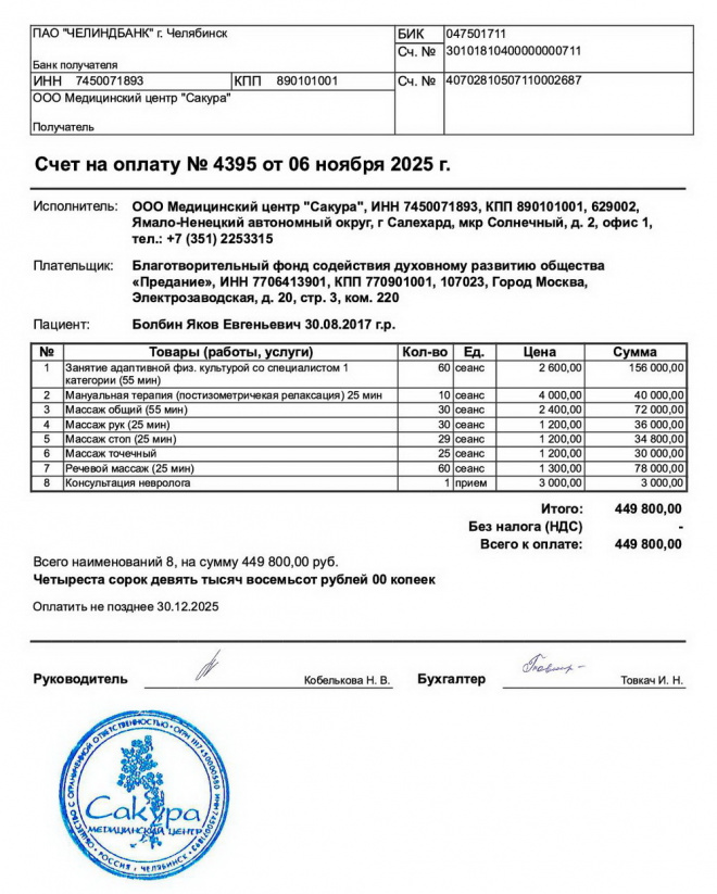 Оплачен курс реабилитации Яши Болбина в МЦ "Сакура"
