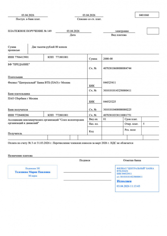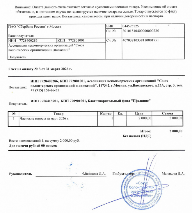 Перечислены членские взносы за март 2026 г. в "Союз волонтерских организаций и движений"