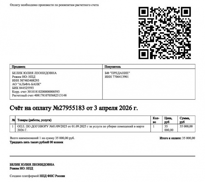 Оплачен счет за уборку помещений по адресу: Москва, ул. Шухова, д. 17, корп. 2 в марте 2026 г.