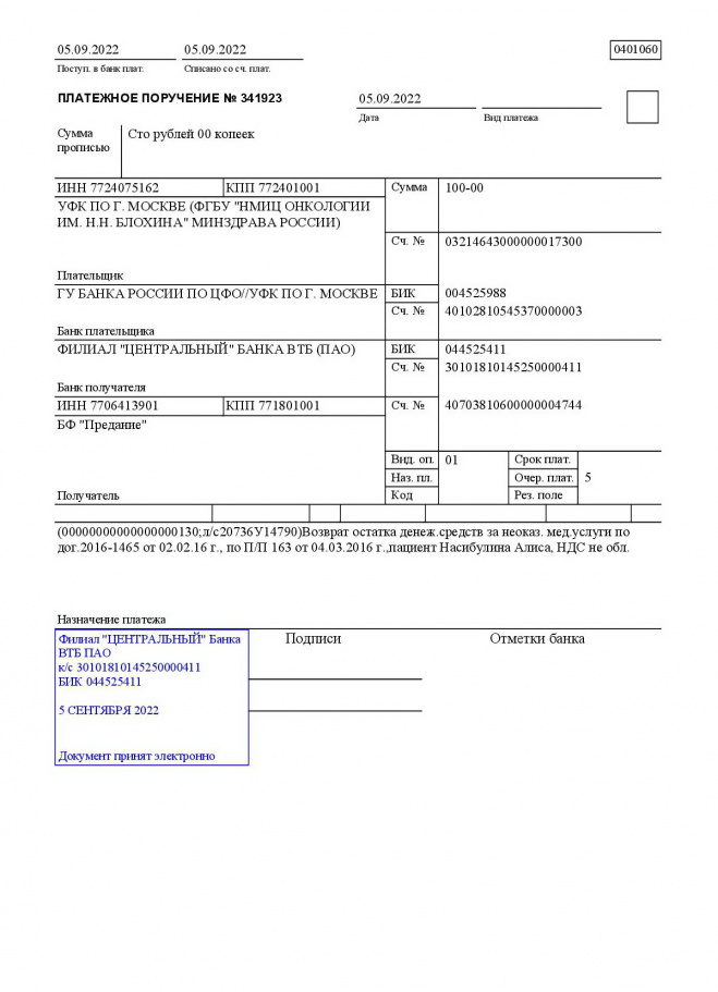 Оплачен счет за лечение лазером Алисы Насибулиной в РОНЦ им. Н.Н. Блохина. Неизрасходованные средства возвращены на счет фонда