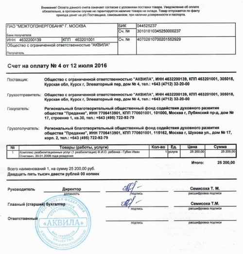 Оплачен курс реабилитации Вани Губина в центре "Аквила"