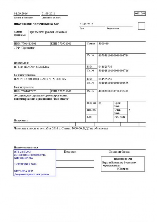 Перечислены членские взносы за сентябрь 2016 года в благотворительное собрание "Все вместе"