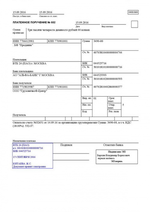 Оплачен счет за транспортировку осушителей