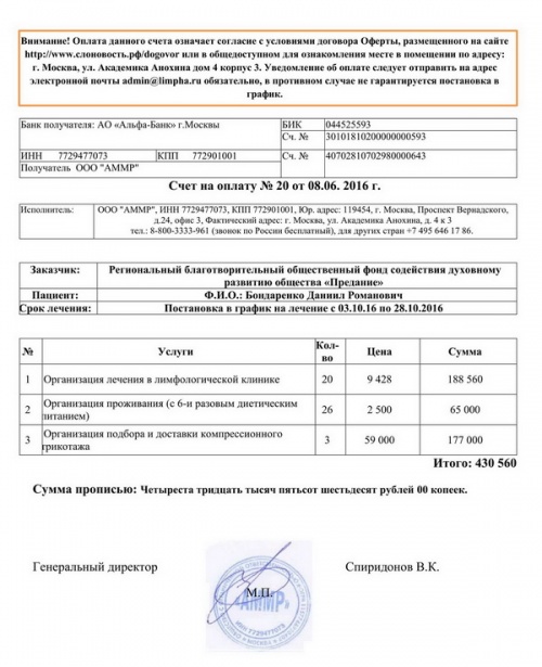 Произведен окончательный расчет за лечение Даниила Бондаренко в специализированной клинике "Лимфа"