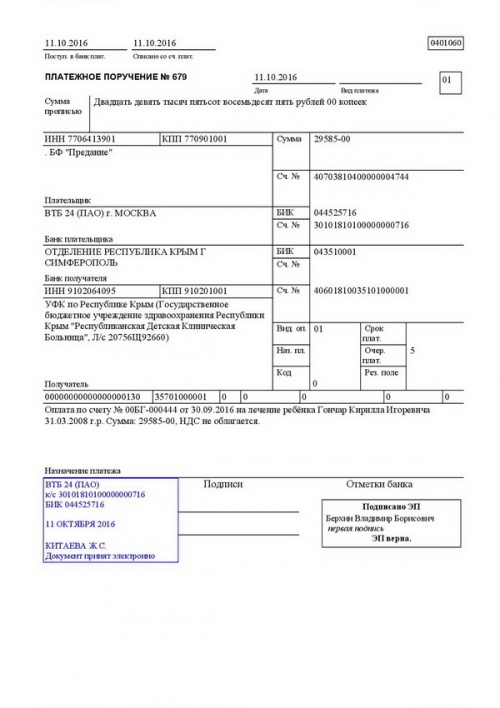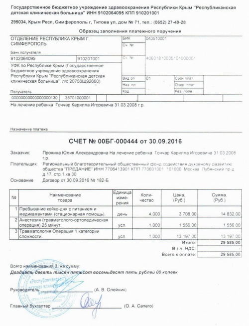 Оплачен счет за лечение Кирилла Гончар в Детской клиической больнице г. Симферополя
