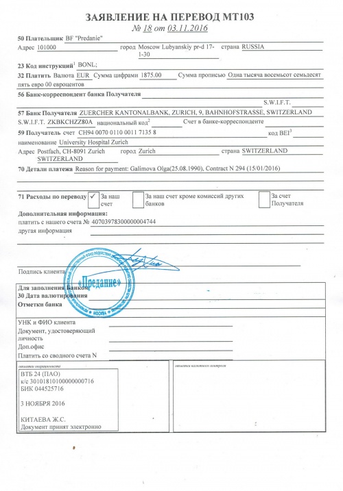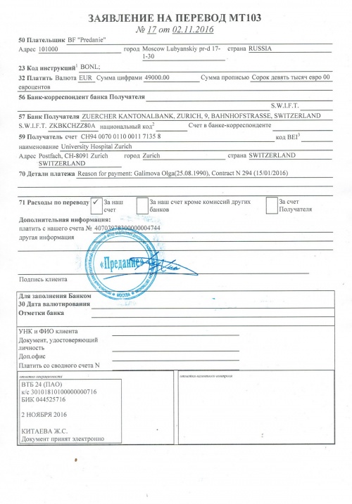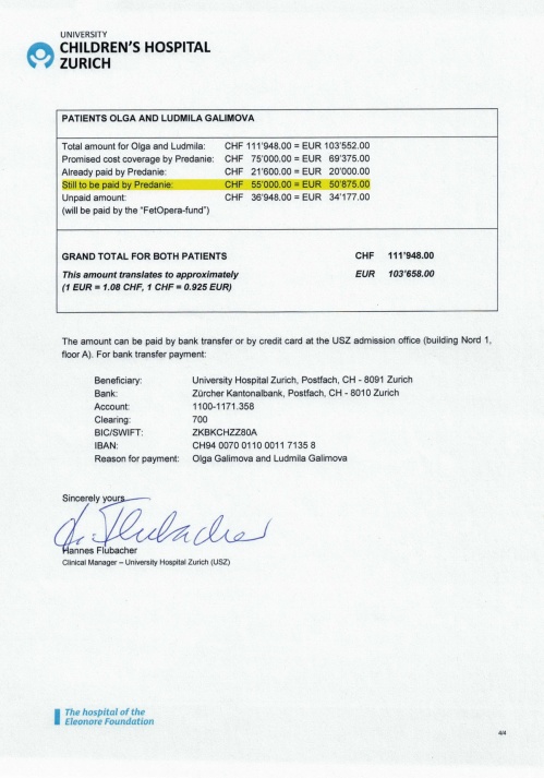Произведен окончательный расчет за операцию и лечение Ольги Галимовой в клинике г. Цюрих