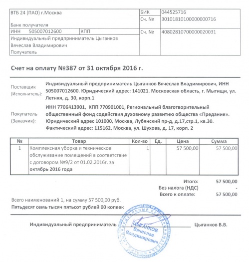 Оплачен счет за комплексную уборку и техническое обслуживание здания, в котором находится наш офис, в октябре 2016 г.
