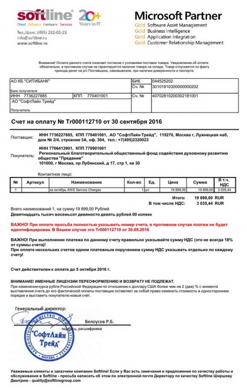 Оплачен счет за размещение наших видеоматериалов в "облачном сервисе" в октябре 2016 г.