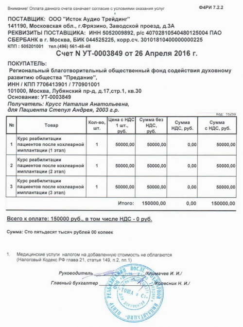 Оплачен счет за три курса реабилитации Андрея Степул в центре для имплантированных детей во Фрязино
