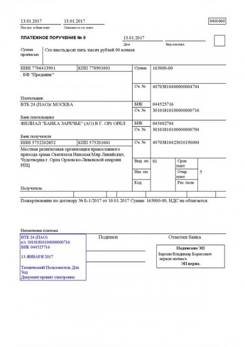 По договору пожертвования переведены средства для проведения отполения в здание Храма Святителя Николая в Орле