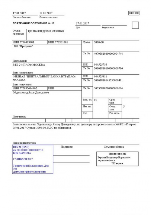 Переведены средства за проведение и расшифровку лекций Андрею Александровичу Боровскому, Якову Давидовичу Эйделькинду и Екатерине Владимировне Кулябко
