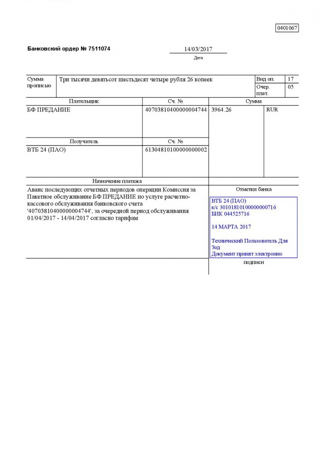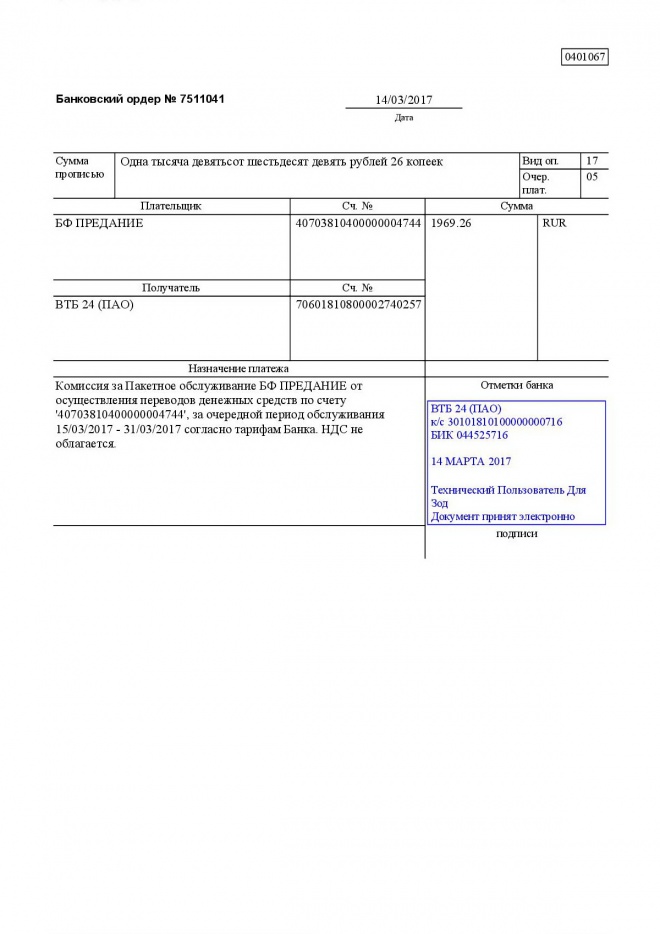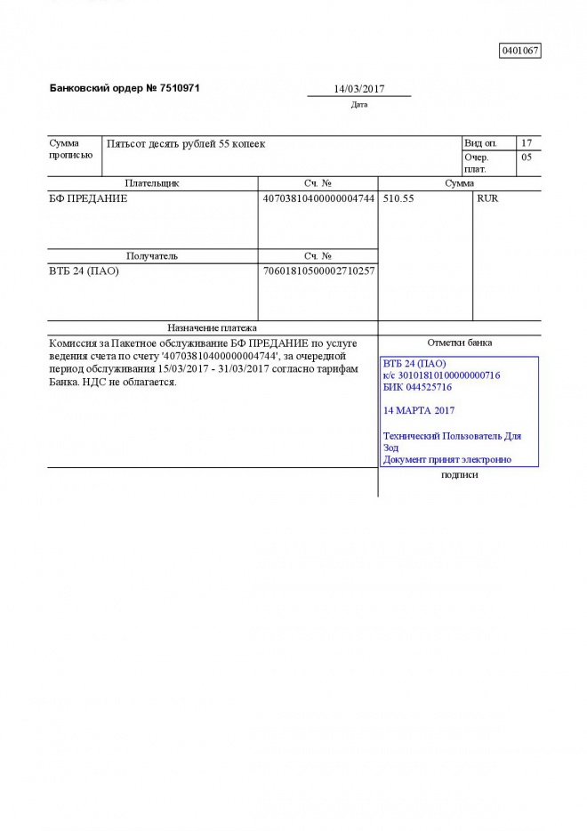 Комиссии по обслуживанию наших банковских счетов в марте 2017 г.