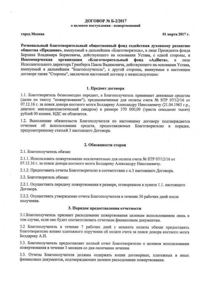 Аванс за поиск донора КМ Александру Болдареву