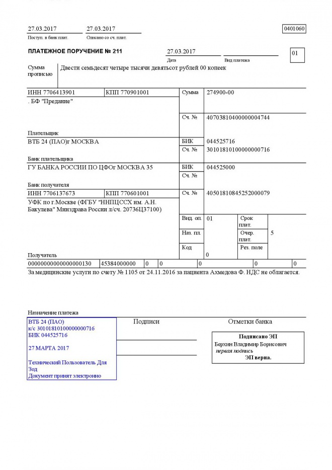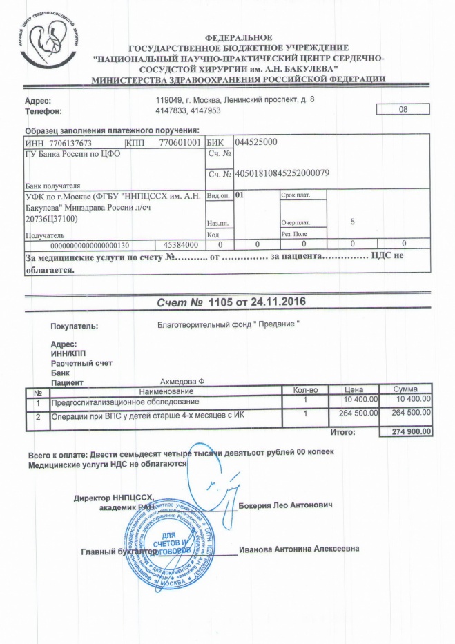 Оплачен счет за лечение Фарахноз Ахмедовой в научном центре сердечно-сосудистой хирургии им. А.Н. Бакулева