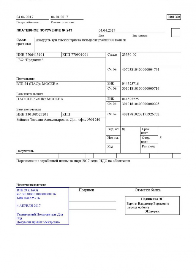 Перечисление заработной платы сотрудникам за март 2017 г.