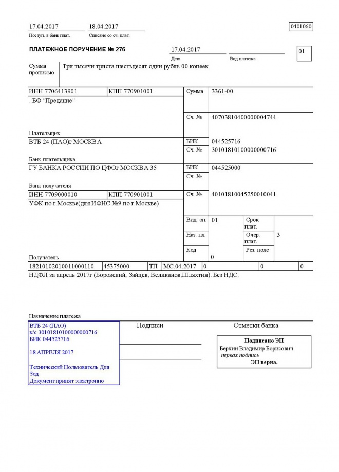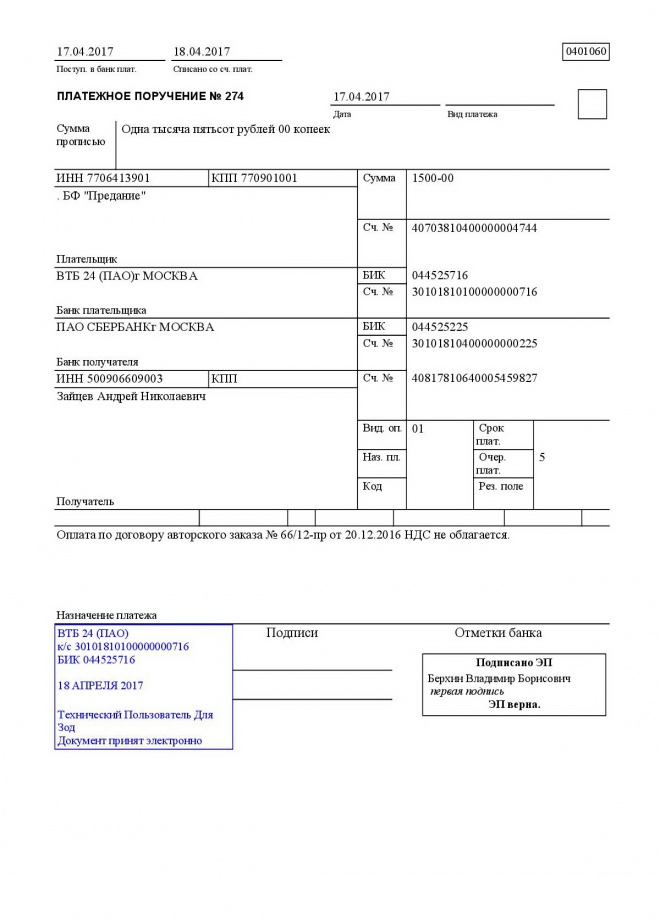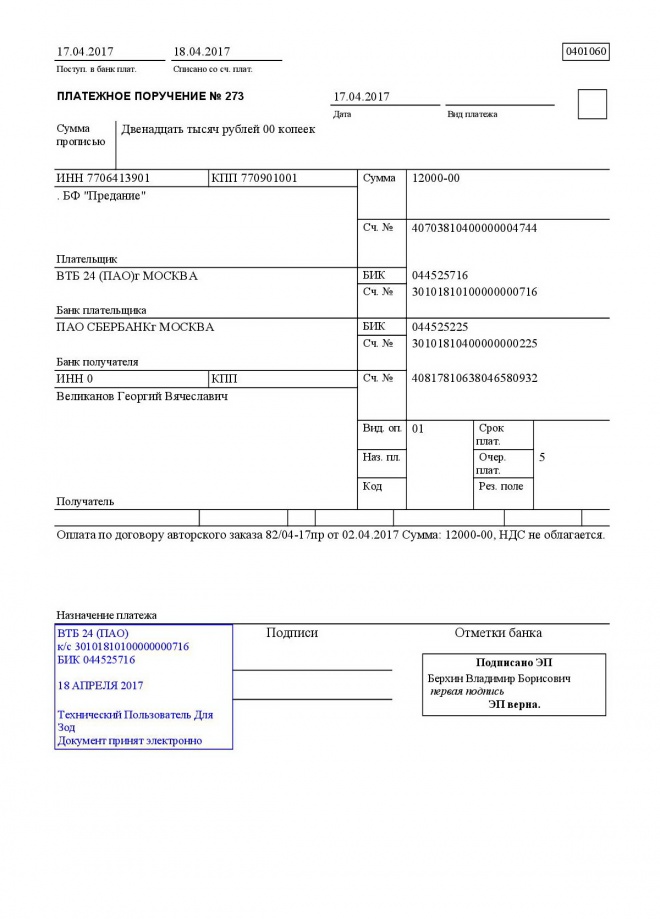 Переведены средства за проведение лекций Андрею Николаевичу Зайцеву, Андрею Александровичу Боровскому, Роману Олеговичу Шляхтину и Георгию Вячеславовичу Великанову за написание цикла статей о Таинствах церкви для нашего блога