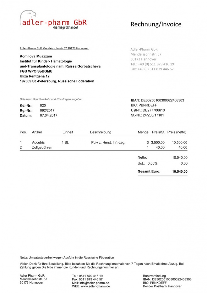 Мы купили Муаззам Комиловой препарат "Адцетрис" на еще один курс лечения