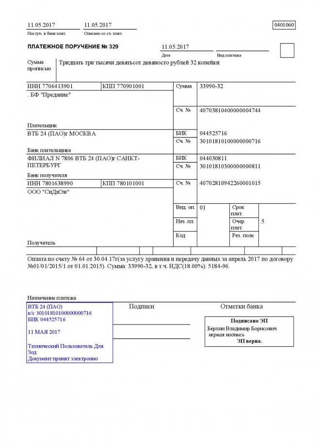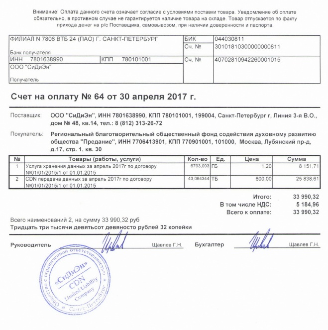 Оплачен счет за размещение материалов медиатеки в "облачном сервисе" в апреле 2017 г.