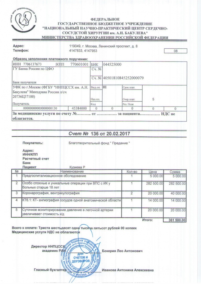 Оплачен счет за лечение Рухшоны Кузиевой в научном центре сердечно-сосудистой хирургии им. А.Н. Бакулева