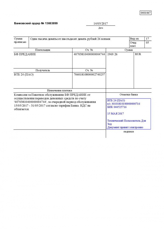 Комиссии по обслуживанию наших банковских счетов в мае 2017 г.