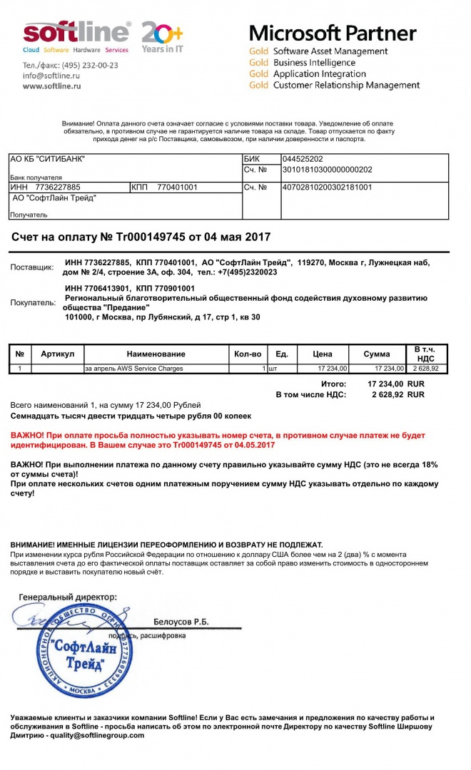 Оплачен счет за размещение наших видеоматериалов в "облачном сервисе" в апреле 2017 г.