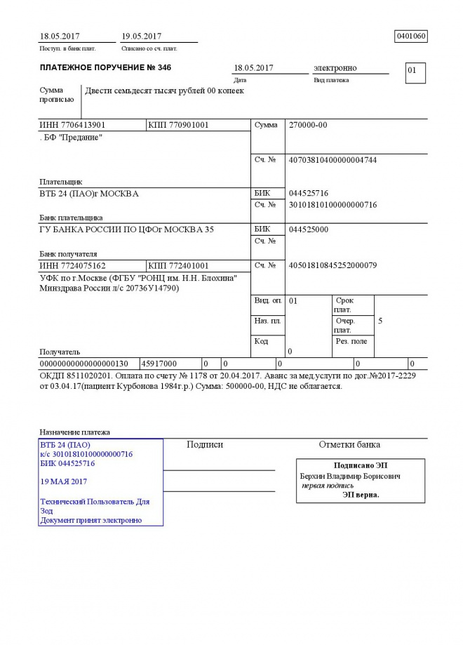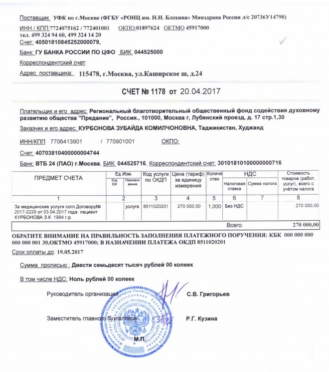 Оплачен счет за проведение операции и лечение Зубайды Курбоновой в РОНЦ им. Н.Н. Блохина