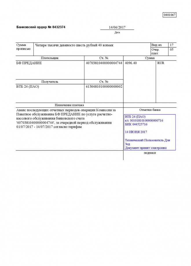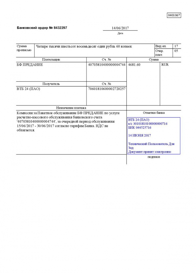 Комиссии по обслуживанию наших банковских счетов в июне 2017 г.