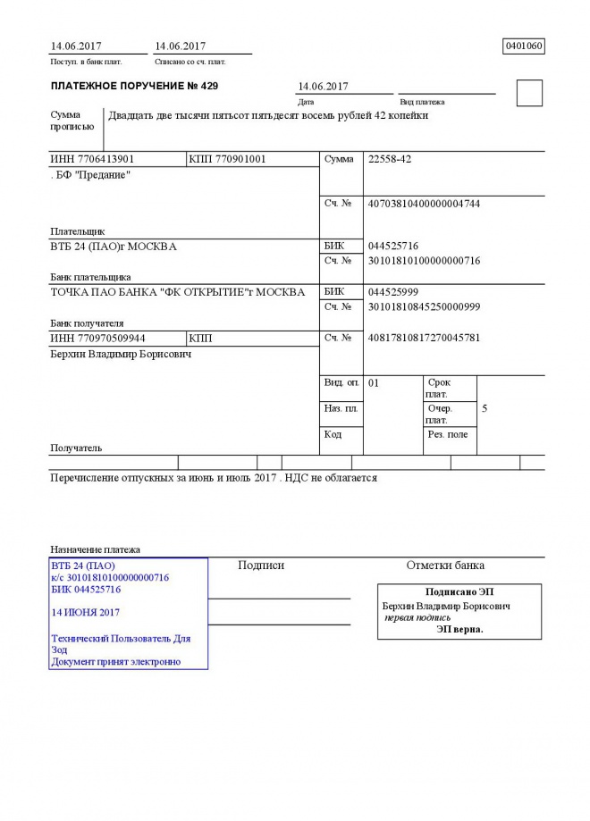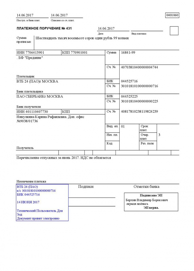 Перечислены отпускные за июнь-июль Карине Никулкиной и Владимиру Берхину