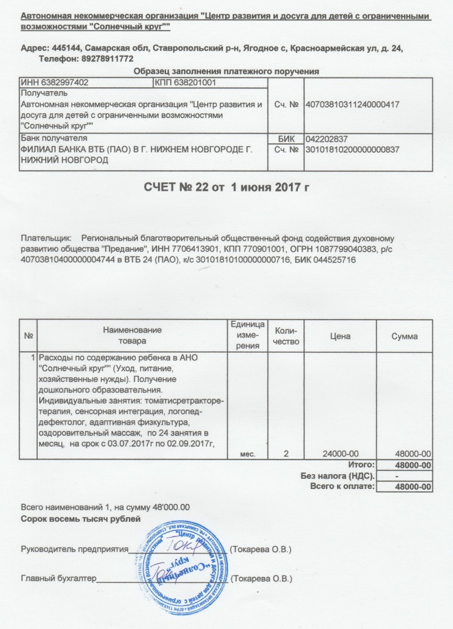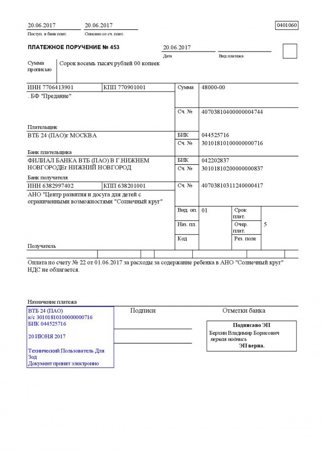 Оплачен счет за образование, содержание и занятия Егора Ерёмина в центре "Солнечный круг" в июле и августе 2017 года. К сожалению, мальчик умер. Часть средств возвращена на счет фонда