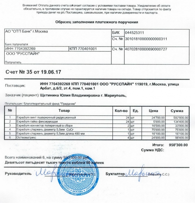 Оплачен счет за конструкцию, необходимую для проведения операции по коррекции позвоночника Юлии Щетининой