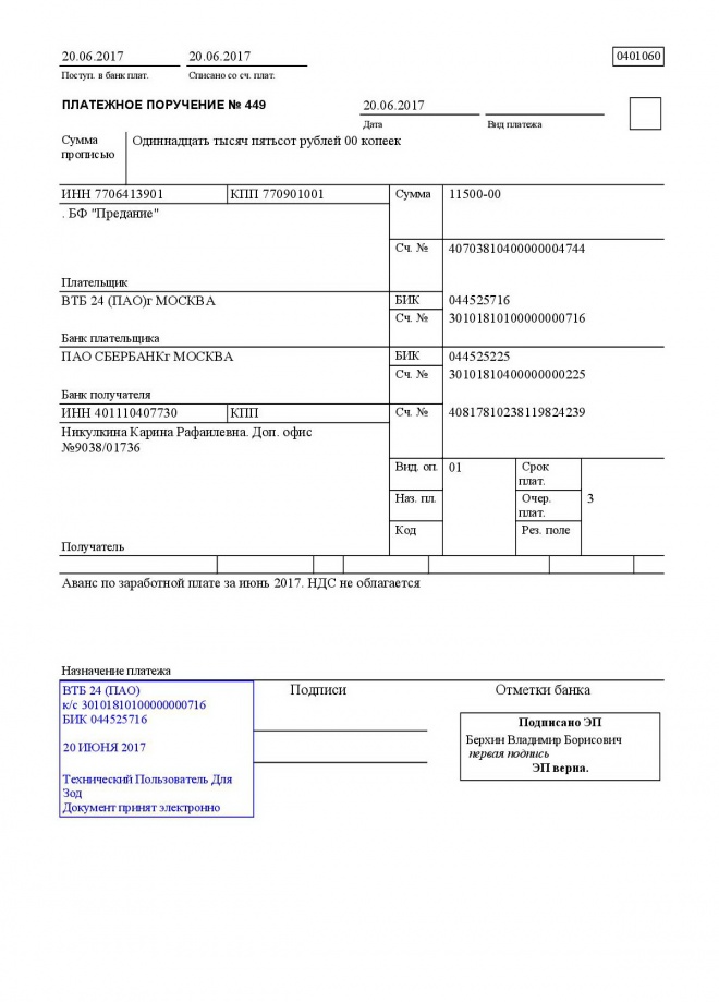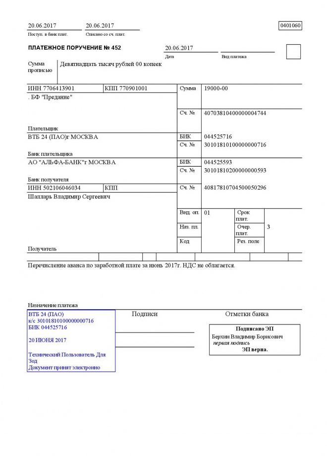 Перечисление аванса за июнь 2017 года