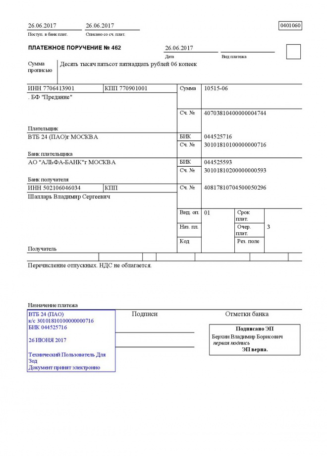 Перечисление отпускных Владимиру Шалларю