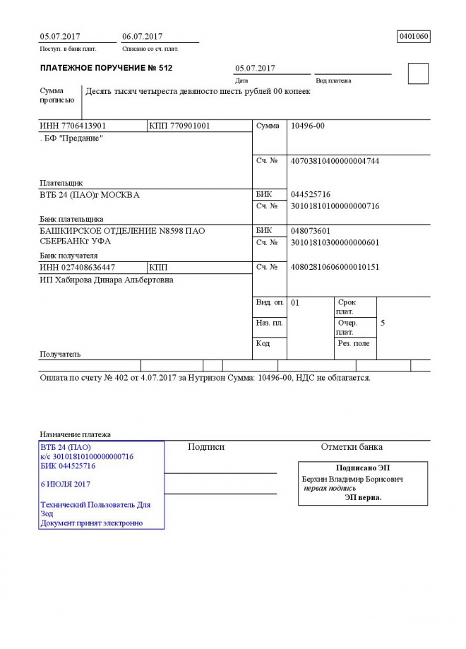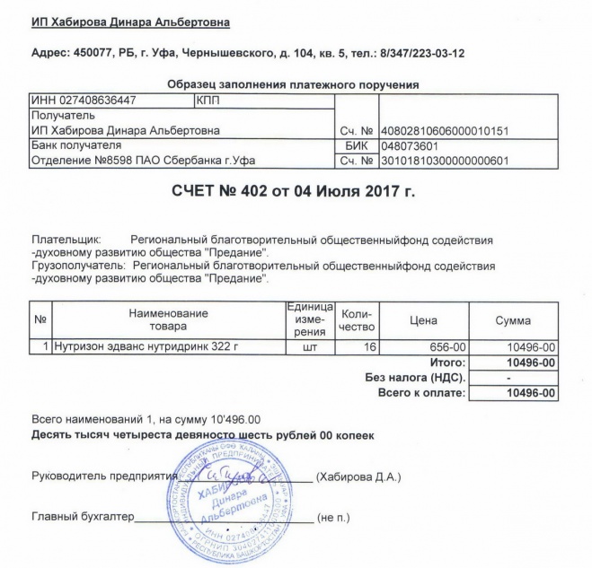 Пожертвование согласно ст.582 ГК РФ. Без налога (НДС)