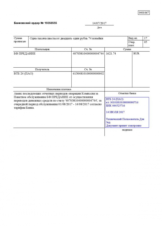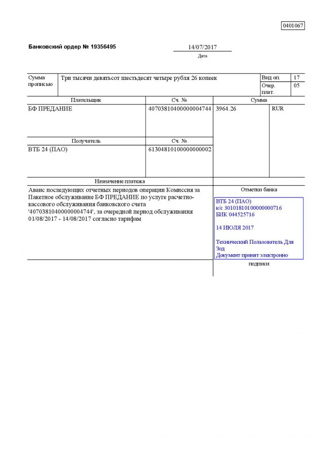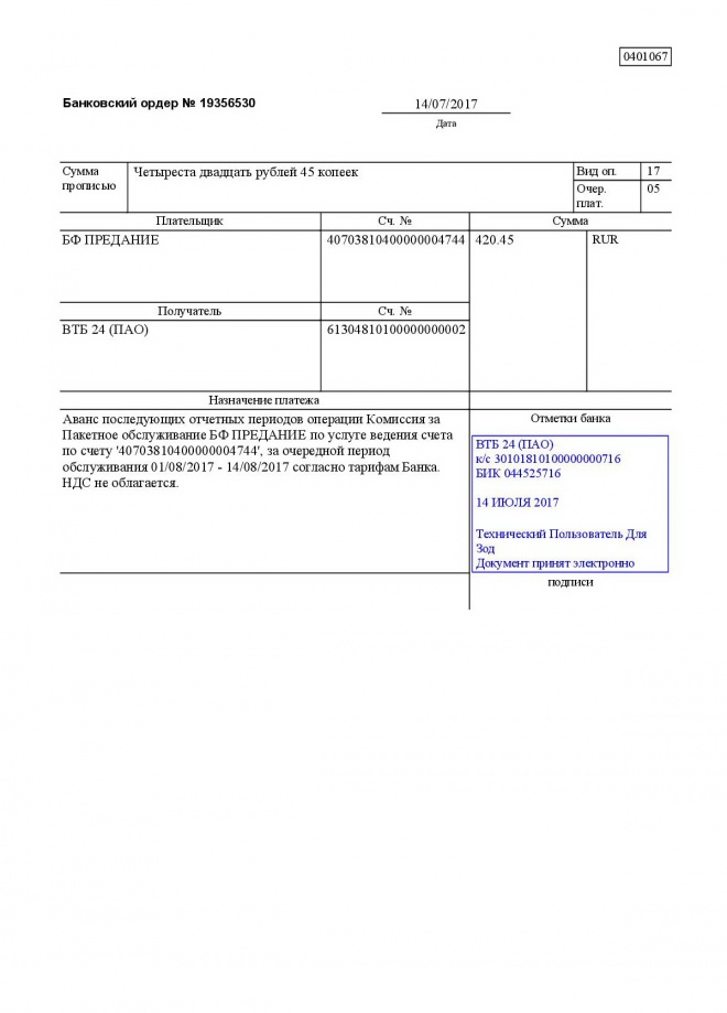 Комиссии по обслуживанию наших банковских счетов в июле 2017 г.