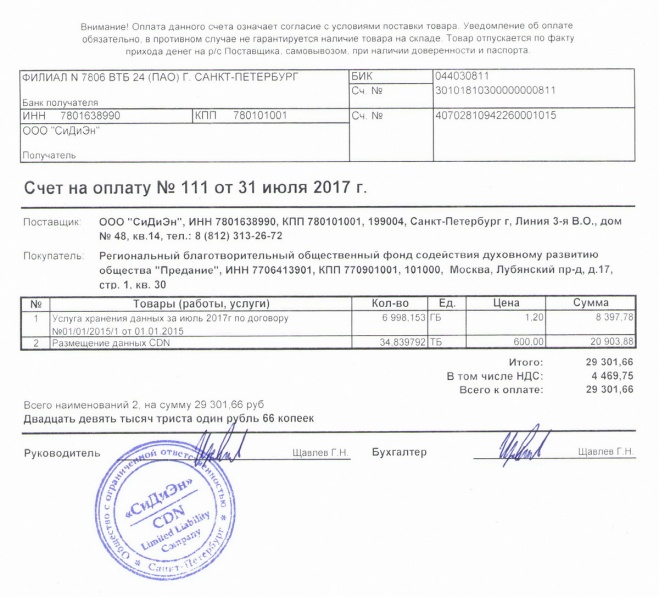 Оплачен счет за размещение материалов медиатеки в "облачном сервисе" в июле 2017 г.