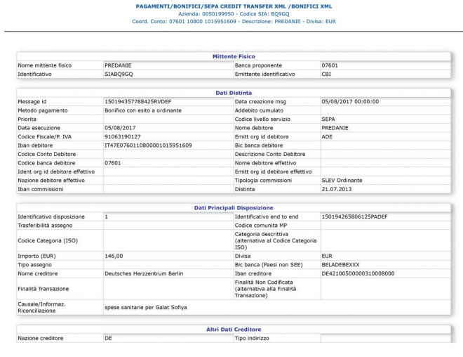Часть оставшихся средств переведена в счет оплаты очередного контрольного обследования Софии Галат в Берлинском кардиоцентре (оплата со счета фонда в Италии)