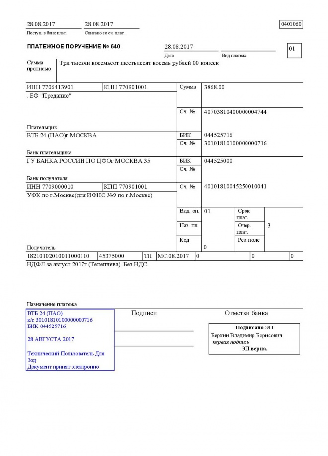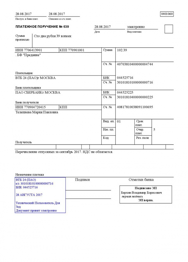 Перечисление отпускных Марии Телепневой