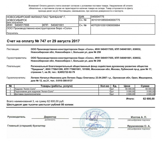 Пожертвование согласно ст.582 ГК РФ. Без налога (НДС)