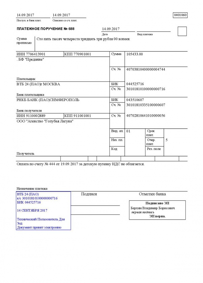 Оплачен курс реабилитации Вани Полякова в специализированном санатории Евпатории. Стоимость лечения оказалась немного меньше и неиспользованные средства возвращены не счет фонда
