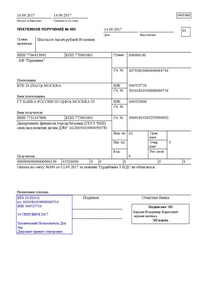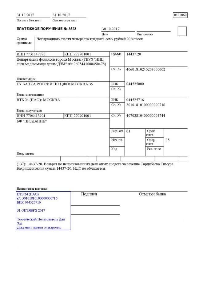 Оплачен второй счет за лечения Тимура Кан (Турдибаева) в паллиативном отделении в НПЦ спец. мед. помощи детям в Солнцево. .Неиспользованные средства возвращены на счет фонда.